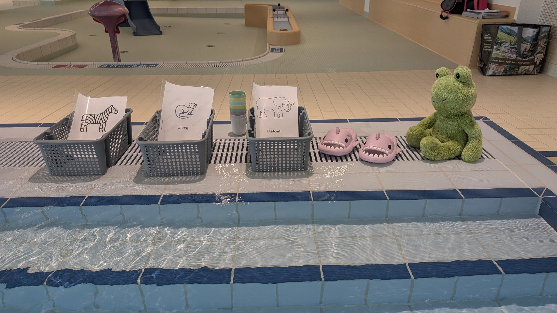 So lernen die Kinder spielerisch den Kopf unter Wasser zu halten, denn mit Musik und als spiel verpackt ist dies viel einfacher.